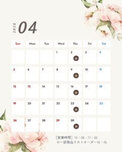 4月は変更は特になく、定休日(木曜日)のみのお休みです!